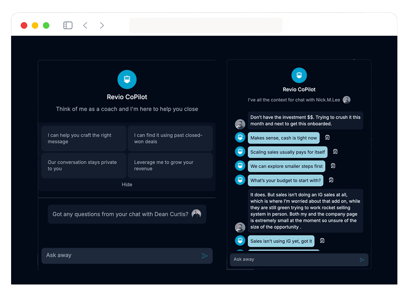 Revio sends DMs to your best followers, tells you exactly what to say next with our fine tuned AI engine, and helps you land more sales.